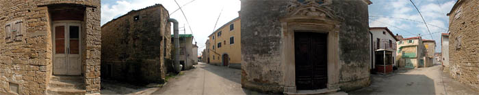 (5.) Županova hiša, št. 27. Največja stanovanjska zgradbav naselju je bila več generacij dom vaških županov. V hiši so prirejali praznovanja in plese. Pročelje krasita lepo oblikovan portal in polkrožna niša s sveto podobo. |