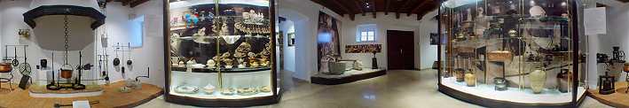 MEŠČANSKA KUHINJA Koprska meščanska kuhinja sodi v mediteransko kulturno okolje. Osrednji prostor je ognjišče, nadkrito s piramidasto napo, ki jo krasi rezljan gotski okvir s konca 15. stoletja, v preteklosti sestavni del ognjišča prav v tej stavbi. Razstavljeni predmeti za pripravo in uživanje hrane so delno še iz 18. stoletja, večinoma pa iz 19. ter preloma v 20. stoletje. Po izvoru pripadajo različnim kulturam, kar je odsev trgovanja s sosednjima mestoma, Trstom in Benetkami, ter z rokodelci iz Furlanije in Benečije. S konca 19. stoletja, ko je bilo pomorsko trgovanje v istrskih mestih že močno utečeno, so porcelanasti servisi in jedilni pribori, večinoma angleškega - davenportskega izvora. Začimbne stekleničke, čajniki, keramične sladkornice in manjši krožniki za sladice izvirajo iz beneškega okolja. Z zlatim robom okrašene čajne skodelice so iz Napoleonove dobe. Bakreni gospodinjski pripomočki za pripravo hrane, kotlički in sklede, izvirajo iz Furlanije. Od tod so tudi majolike, večje lončene posode in železne ognjiščne priprave: bogat zaglavnik za naslanjanje polen, veriga za obešanje kotlička z beneškim imenom kadenja, lopatice in klešče za žerjavico, trinožni podstavki - trplje, več vrst gradel, železne vrtljive posode za pečenje ječmena - bruštolini in mehanizem za vrteči raženj. Vsestransko uporabni železni in leseni mlinčki, priprava za izdelovanje rezancev, sladoleda, boteljiranje šampanjca in stiskalnice izvirajo iz nekdanje Avstro-Ogrske, steklenice in kozarci v živih barvah pa prihajajo iz čeških steklarn. Kamniti predmeti, ročni mlinči za mletje ječmena in pšenice - žrmlje, posode za hranjenje vode in možnarji za tretje začimb so bili izdelani v istrskih kamnoseških delavnicah. |