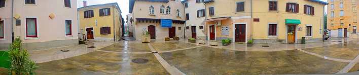 TRG-HIŠA Beneško-gotska hiša je bila zgrajena na obrobju mesta, ob obzidju v 14. stoletju. Nekdanji trg sv. Petra, na katerem stavba stoji, je imel v življenju koprskih ribičev in solinarjev pomembno prostorsko vlogo. Trg je bil zaključen z velikim skladiščem soli, dostopnim nesposredno z morja, iz mandrača, kjer je bilo tudi sidrišče ribiških bark. Casa veneta a gheffo je stavba z nadstropnim pomolom, ki sloni na rezljanih lesenih nosilcih. Pritličje je zidano iz nepravilnih kamitih blokov, nadstropje iz opeke. Sredi opečne fasade je bogata gotska okenska bifora s trilistnima vrhoma, ločena s stebričkom. Centralno okno obdajata trilistni okenski monofori, leva tudi s kamnito polico na konzolah. Na pročelju stavbe, na desni strani, je ohranjen kamniti prstan. V stranski fasadi, v Levji ulici, sta v nadstropju okenski monofori s trolistnima lokoma. Monofori sta bili kasneje nekoliko predelani. |