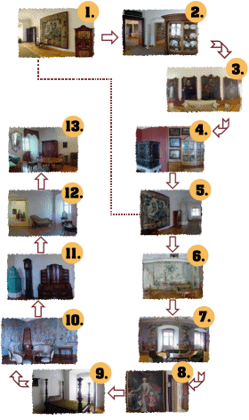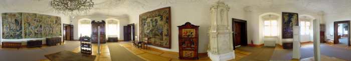 V nekdanji jedilnici z bogato štukiranim stropom je razstavljenih nekaj najdragocenejših kosov pohištva in tapiserij, ki jih hrani ptujski muzej. Bruseljske tapiserije iz začetka 17. stoletja so del nekdaj zanesljivo obsežnejše serije s prizori iz Odiseje. Na ptujskih tapiserijah so se ohranili naslednji prizori: Odisej reši Telemahu življenje, Odisej ponuja Polifemu pijačo, Odisej s tovariši pobegne Polifemu iz votline in Odisejevo slovo od fejaškega kralja Alkinoa in njegove hčere Nausikae (v restavriranju). V muzeju je na ogled tudi šest francoskih tapiserij s konca 17. stoletja. Na Slovenskem se je ohranilo malo teh dragocenih tkanin. Največjo zbirko hrani prav ptujski muzej. |