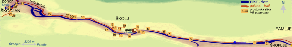Sušica nestalni potoček Polog. Soteska reke Reke ima videz kanjona, saj je planotasti svet nad levim in desnim bregom struge približno na isti nadmorski višini: desni breg, ki je v krednem apnencu (K23), ima nadmorsko višino okoli 400 m, levi breg, ki sega iz krednega apnenca v Paleogenski apnenec (K,Pg) prav tako okoli 400 m. Kljub padcu reke za samo 16 m, je tako soteska vedno globja in je pri vhodu v Mahorčičevo jamo v katero sega iz naselja Škojan brezno Okroglica, globoka že skoraj 100 m (90 m do vrha jame). Najožji del soteske reke Reke je pod gradom Školj na sredni soteske, najširši del na območju Nad Malni. Na desnem bregu, pred zoožitvijo soteske pod gradom Školj so vidni tudi značilni spodmoli v katerih je vidna delna zasiganost. Na desnem bregu reke, zahodno pod ravanjo Školja je nekaj metrov od struge manjša votlina. Na dnu reke in ob oblali so prodniki različnih velikosti, ki so oglatih oblik in najbolj verjetno niso samo alogeni ampak so nastali tudi 'insitu', v sami soteski kot podorne skale in posledica denudacije z roba soteske. Opazno je, da so prodniki s tokom reke v sotesko vedno manjši. Nastanek 'slepe doline' reke Reke še ni pojasnjen in malokdo se je spuščal v pisanje oz. razlago nastanka. Glede na kontaktni kras je, kot je že omenjeno v besedilu, vsaj prvotna faza nastanka soteske lahko 'slepa dolina'. Vendar je možnosti za nastanek soteske lahko več. Z korozijo površja se je strop nekdanje jame, ki je nastal z erozijskim delovanjem reke Reke tanjšal, dokler niso na mestih velikih dvoran zaradi statičnega neravnovesja popustili stopi in so prvotno na mestih nastale udornice - podobno kot je v Mali in Veliki dolini. Z nadaljnim korozijskim delovanjem na karbonatno kamnino je preostanek rovov postopoma izgubil strop - brezstopa jama. Erozijsko delovnje reke Reke je preprečilo nastanek usedlin in zapolnjenje jame - vodotok je ostal aktiven v svoji strugi in izpoblikovala se je danjašnja soteska - brezstropa jama? Možen je tudi kanjonski nastanek, ko je po prvotno fluvialnem reliefu tekla reka, ki se je po erozijskem delovnju na podlago ujela v apnenec in ga postopoma dolbla. Skratka glede na pomembnost Regijskega parka Škocjanske jame in o 'malo napisanega' na temo 'slepe doline' reke Reke reke bi bilo nastanek soteske potrebno detaljno terensko preučiti in poiskati ključe po katerih bi se naredila klasifikacija. Med zniževanjem ponorov in kanjonov pred udornicami na območju Škocjanskih jam je v Vremski dolini nastala 5 km dolga slepa dolina. Če bi začepili vse ponore, bi zadržala čez 400 milijonov m3 vode, kar je največ od slepih dolin na Slovenskem. Doline pa reka Reka, ki ponika na n.v. 317 m, ni izdelala samo s korozijo apnenca, marveč tudi z erozijo fliša. Apneniška podlaga fliša (apnenec) se namreč stopnjasto zvišuje proti zahodu. Od stika fliša z apnencem do ponora v Škocjanske jame je reka Reka v Vremski dolini ponikala že v preteklosti. Hidrologi so že prej izmerili, da 600 m pod vodomerno postajo Cerkvenikov mlin izginja v tla čez 0,5 m3/s. Mlinarji so ponore v apnencu od nekdaj mašili - okoli 12. septembra 1982 je vsa Reka ob pretoku 0,01 m3/s (vir: Gams, Kras v Slovenije) izginila v na novo udrto brezno že kmalu po prehodu na apennec pod Gornjimi Vremami. Skoraj 20 m globoko udornico je Reka zasula in preplavila šele po nalivu 2. oktobra. Glede na to dejstvo je pod dnom Vremske doline in Škocjanskimi jamami splet kanalov, ki lahko sprejmejo vso Reko, ki ima pretok manjši od 0,01 m3/s (10 l/s). |