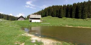 Planina Kranjska dolina je primer ledeniško-kraškega reliefa. Ledenik je v pleistocenu naredil kotanjo in pozneje je v njej nastalo jezerce. slabša ločljivost (LO resolution) |