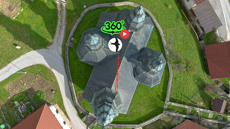 virtualna ekskurzija 360° Župnijska cerkev sv. Jakoba v Okonini je ena najbolj prepoznavnih sakralnih stavb Zgornje Savinjske doline, znana po štirih stolpih, ki ji dajejo edinstveno, skoraj katedralno silhueto. Jedro kraja se je razvilo okrog cerkve na prodni rečni naplavini, kar pojasnjuje njeno dominanto lega nad levim bregom Savinje in vlogo prostorskega označevalca naselja. Cerkev je bila večkrat preoblikovana; po požaru leta 1934 jo je skupnost obnovila v osemdesetih letih 20. stoletja, s čimer je dobila današnjo podobo.