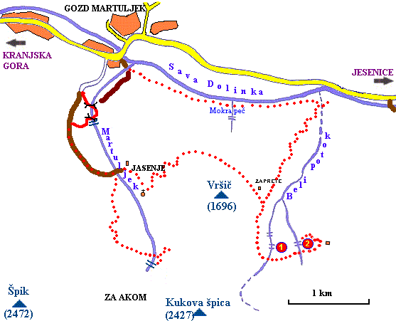 a) Najkrajši je čez stari železniški most do izliva Belega potoka v