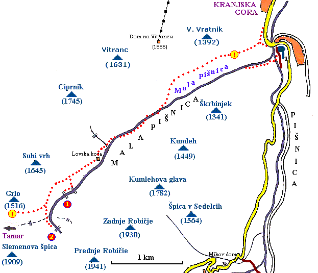 DOSTOP: Iz Kranjske Gore krenemo po cesti proti Vršiču. Pred jezerom in umetnim jezom se moramo obrniti na desno po lepo shojeni poti, ki vodi tudi na Vitranc. Sledimo poti, ki vodi na levo nad potok. (Desni odsek, nas popelje proti Vitrancu.) Ustavi nas tabla z opozorilom na nevarnost poti. Hoja naprej ni varna zaradi neurejene poti in plazin. Če pot nadaljujemo (s primerno planinsko obutvijo), se hitro dvignemo nad potok in hodimo nad njegovim levim bregom. Sama steza je speljana preko strmega brega, ki ga na več mestih sekajo plazine. Velika je tudi nevarnost krušljivih skal. Po uri plezanja in hoje se pot spusti k potoku in tudi izgine, saj jo je odnesla deroča voda. Po produ nadaljujemo pot navzgor, dokler ne pridemo do sotočja dveh potokov. Pot postane tu zopet vidna ter nas popelje do lovske koče. Od tu sledimo slabo vidni in nemarkirani poti. Ko se začne pot dvigati na desno v hrib, se lahko spustimo k potoku, kjer naletimo na spodnje slapove: najprej na slap (45°), visok osem metrov, nato na slap, visok 4 m in malce dalje na zelo lep in izrazit, 8 m visok slap s tolmunom. Tu se moramo vrniti na pot. Po 15 minutah hoje se pot razcepi. Na desno nas popelje do prelaza Grlo in naprej v Tamar. Ta pot je tudi ena izmed možnosti dostopa iz Tamarja, vendar je slabo vidna in na prelazu jo je deloma odnesel velik plaz. V levo nas zaraščena pot popelje v mogočen amfiteater, kjer lahko ob močnejšem dežju opazujemo kar nekaj lepih slapov, od katerih je stalen samo Veliki slap Male Pišnice. |