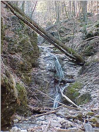 Upper waterfalls- lover part. Below the cliff Height: 4 m ~ 12 . Waterflow: dry weather. Time: march 2000 Zgornje slapišče - spodnji šum. Višina: 4 m. Pretok: sušno obdobje; marec 2000 |