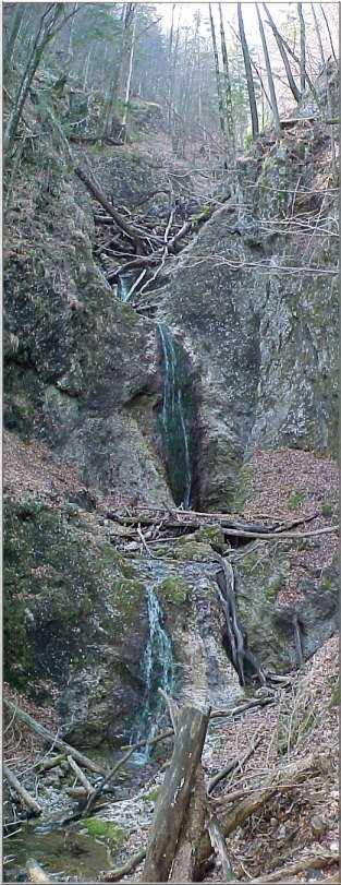 | Lower waterfalls-upper part. Height: 20 m ~ 60 . Waterflow: dry weather. Time: march 2000 Spodnje slapišče. Višina: 20 m. Pretok: sušno obdobje; marec 2000 |
