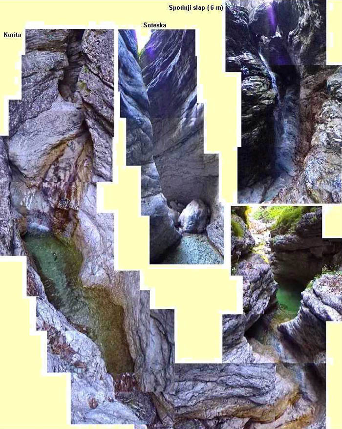 s tolmunom. Spodnji, mnogo višji slap ostaja viden samo alpinistom (soteskarjem)