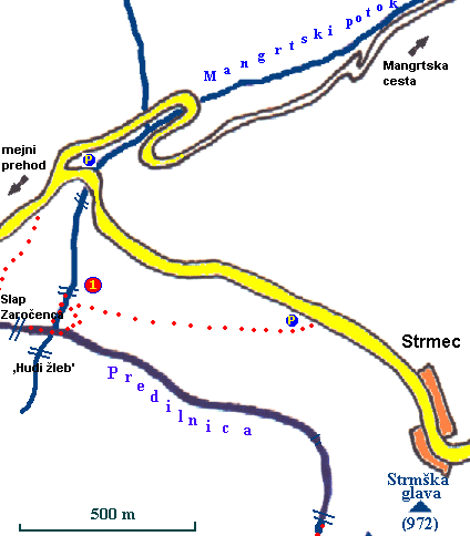 DOSTOP: Del korit si lahko ogledamo z mosta malo pod cestnim odcepom s predelske ceste proti Mangartu. Takoj za odcepom je večje parkirišče, kjer lahko ustavimo vozilo. Malo nižje je most, odkoder je možen pogled v globino. Spust ni priporočljiv in je celo nevaren, saj lahko kaj hitro zdrsnemo v globino. Za ogled spodnjega toka in sotočja Mangrtskega potoka in Predilnice, se od parkirišča spustimo po predelski cesti do smerokaza na desni strani ceste z napisom Slap Zaročenca. Dostop je možen tudi iz vasi Strmec po cesti navzgor, do omenjenega smerokaza. Lepo označena sprehajalna potka se zlagoma spusti k sotočju Mangrtskega potoka in Predilnice. Ob sotočju krenemo po skalovju na desno do vhoda v ozko sotesko. Ob visokih vodah je neprehodna. Poleti, ko je voda toplejša, lahko vsaj nekaj prvih metrov v soteski občutimo tesnobo ozkih korit. Za globlji obisk korit je potrebno obilo previdnosti, saj je struga izredno spolzka. Približno 30 m globoko v koritih je zanimiv, 6 m visok slap, nad katerim je med stene soteske kot most vgnezdena velika skala. Zaradi varnosti je pri dostopu priporočljiva čelada. |