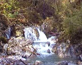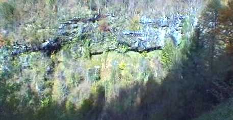 konglomeratna, teče potok skoraj pravokotno na njene gubaste plasti. Spodaj