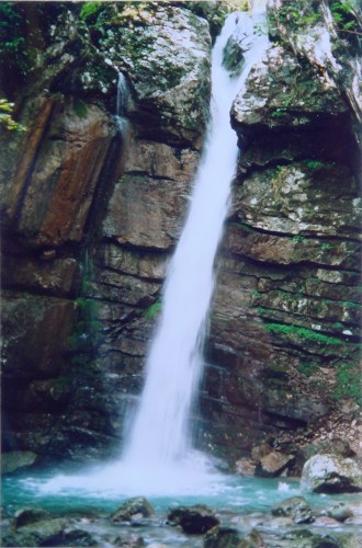 zidovi, visoki kot slap na koncu kotanje. Pri izteku potoka se previdno
