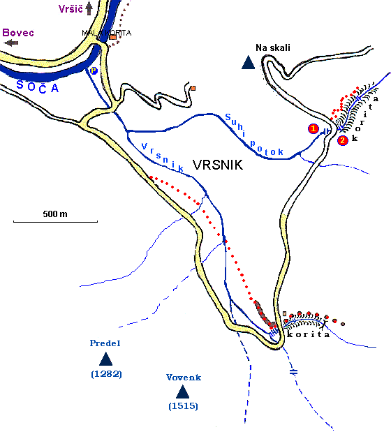 Suhi potok je ime za desni pritok Vrsnika. Za razliko od korit Vrsnika, so njegova korita v zgornjem toku globoko vrezana v apnenec. Varen pogled vanje je možen samo z mosta, ki vodi preko struge prav nad skrajnim spodnjim delom korit. Od tu se vidi spodnji, 10 m visok slap v koritih, ki pada tik pred mostom. Od mosta, ob desnem bregu korit navzgor, vodi serpetinasta stezica. Pri previdnem pogledu v globočino se odpre čudovit pogled na slapove v koritih in smaragdne tolmune pod njimi. Višino je težko določiti, toda vsaj trije so visoki med 7 do 10 m. Če se vrnemo nazaj do mosta in makadamske ceste, lahko občudujemo nenavadno "izbočeno" apnenasto strugo preko katere šumi potok. Dostop: Pri Malih koritih Soče vodi most s cesteTrenta - Bovec proti Vrsniku. Po asfaltirani cesti nadaljujemo pot proti vasi Na Skali (odkoder je tudi lep panoramski razgled na območje Vrsnika in Sočo). Po približno 4 km asfaltna ceta preide v makadamsko. Še 1 km poti in pridemo pod korita Suhega potoka. |